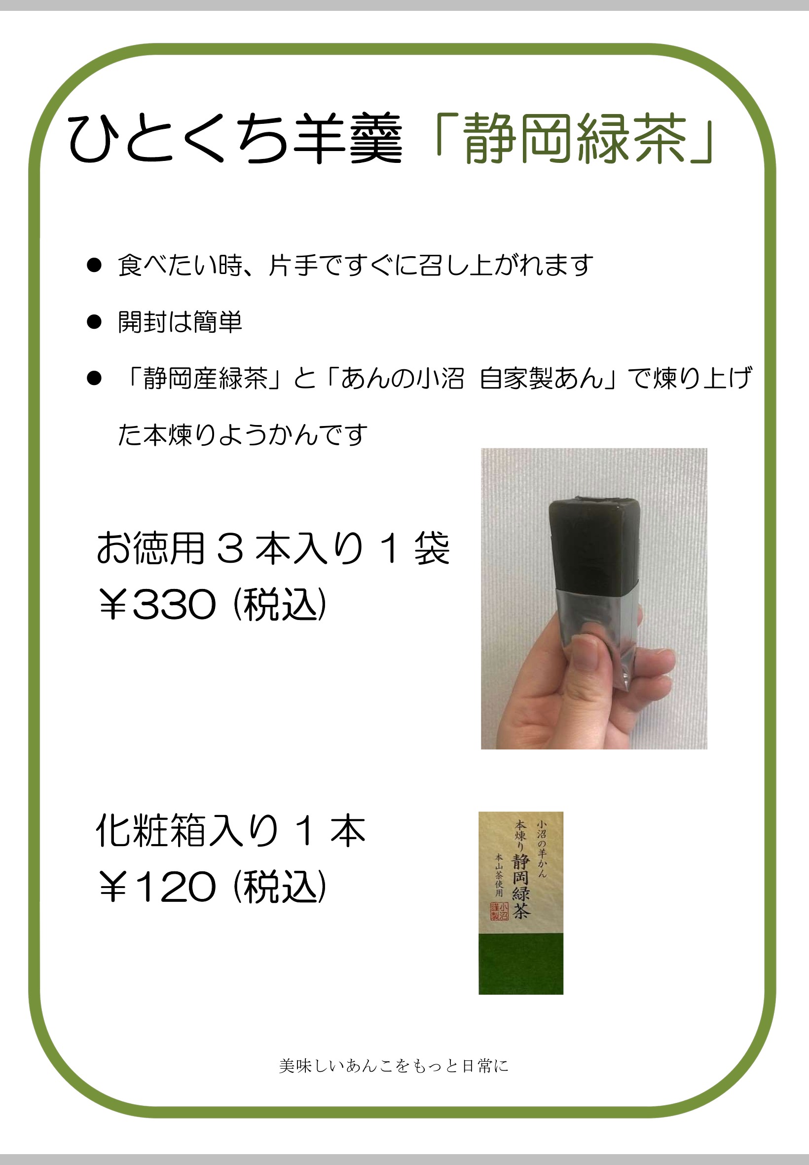 ひとくち羊羹「静岡緑茶」を9月15日から直売所にて販売開始します
